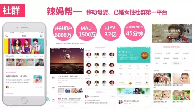辣媽幫創(chuàng)立于2012年5月,僅用了4年時間,便擁有了6000萬的用戶。辣媽幫致力于打造全新母嬰生態(tài)鏈,旗下四大應用“孕期伴侶-辣媽幫-荷花親子-辣媽商城”涵蓋了女性“育兒-生活-情感-消費”四大領域。